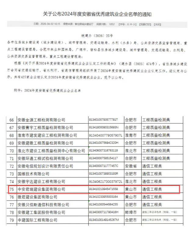 近日,安徽省住房和城乡建设厅等四部门联合发布《2024年度安徽省优秀建筑业企业名单》(皖建办〔2026〕25号),中安君瑞建设集团凭借过硬的综合实力,再次成功入选全省427家优秀企业行列,这是集团连续多年获此省级权威荣誉。
